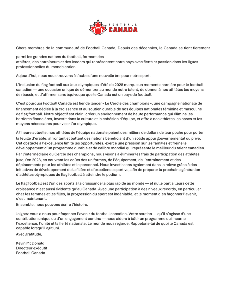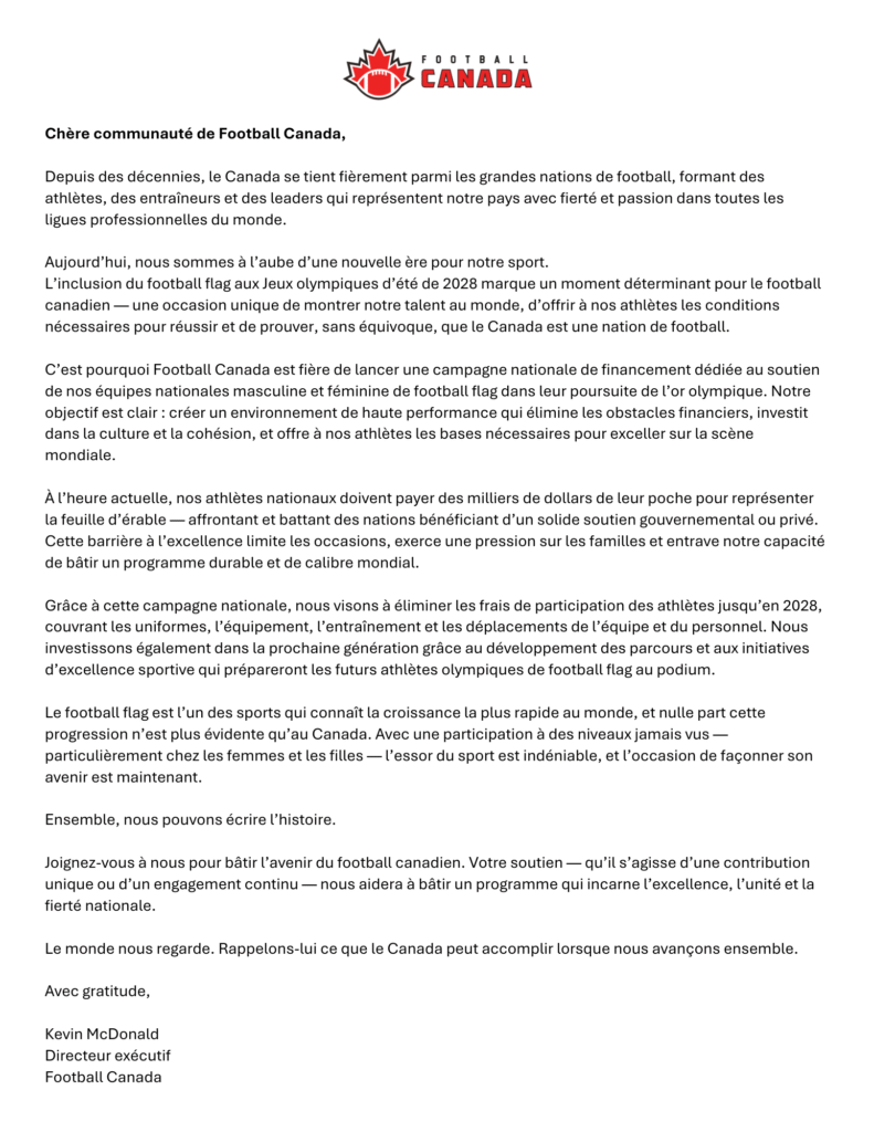 Lettre de Kevin McDonald, directeur exécutif de Football Canada