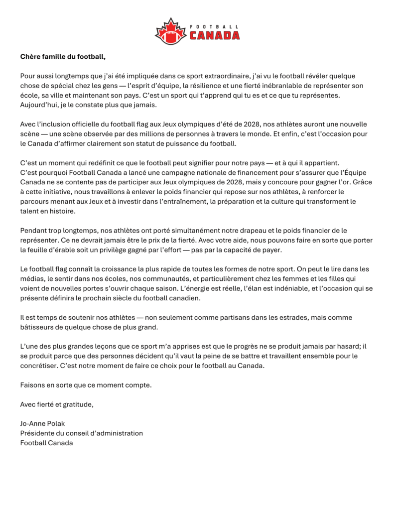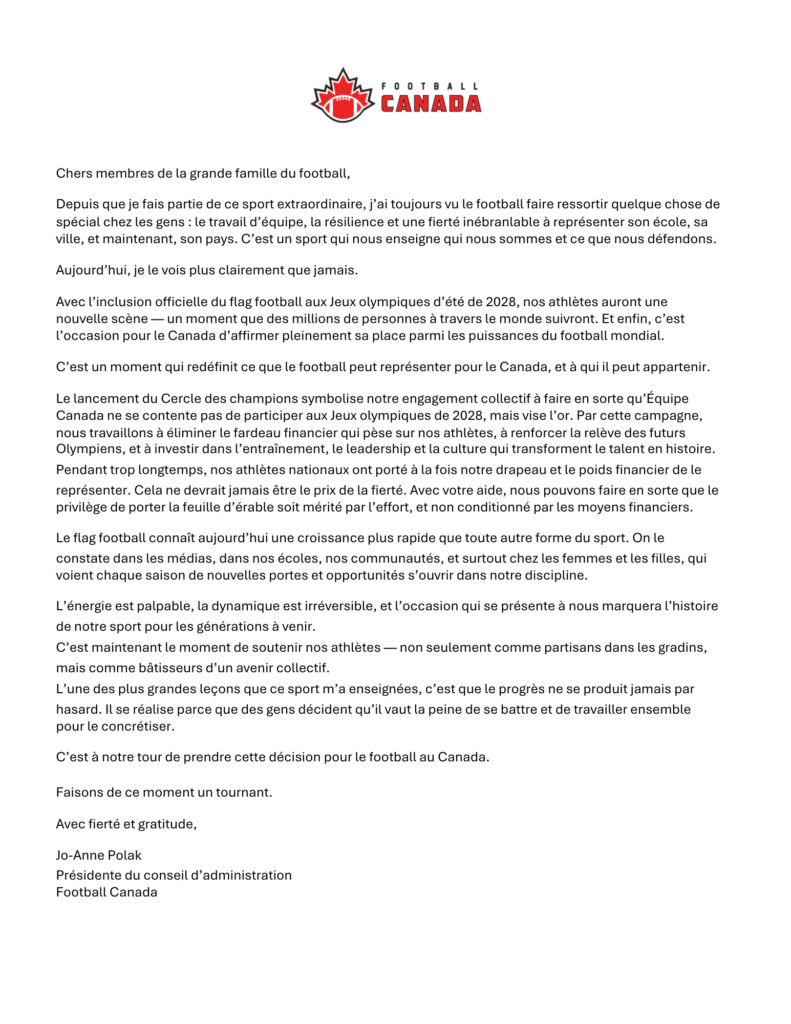 Lettre de Jo-Anne Polak, présidente du conseil d’administration de Football Canada