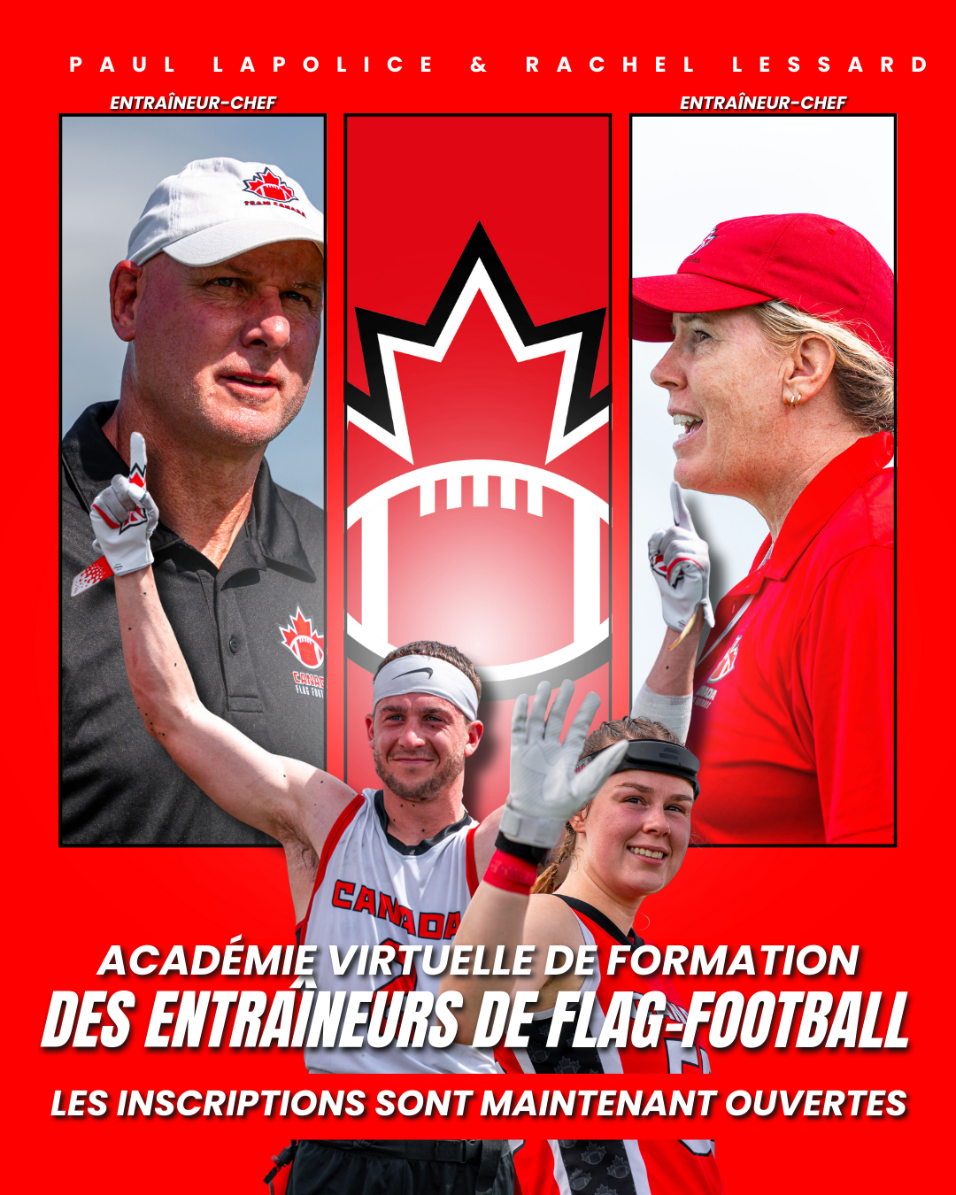 Dirigée directement par des membres des équipes d’entraîneurs des équipes nationales masculine et féminine de flag-football du Canada, cette première académie destinée aux entraîneurs de flag-football sera le seul programme national de ce genre au pays à offrir des cliniques structurées et éducatives tant pour les entraîneurs que pour les joueurs. Toutes les séances seront offertes en ligne, rendant l’académie accessible partout au Canada.